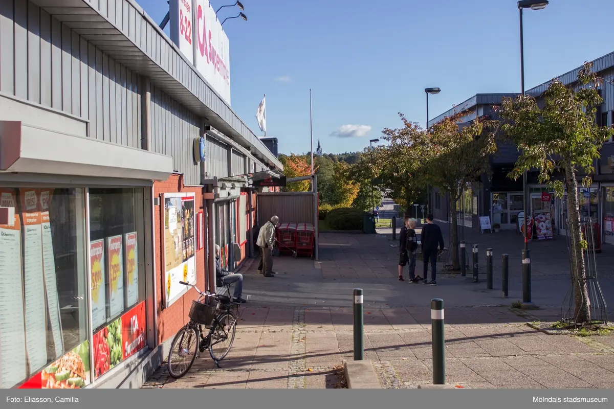 Almåsgången i Lindome centrum, den 4 oktober 2016. Gatans sträckning mot öster. Till vänster ses huset Almåsgången 2, som inrymmer ICA Supermarket. Till höger ses huset Almåsgången 1.
