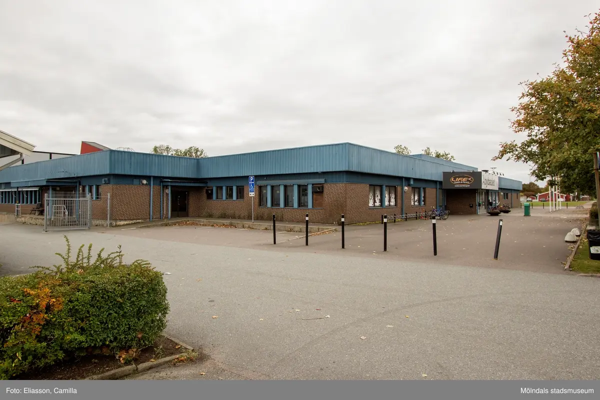 Åbybadet/Åby simhall med adress Idrottsvägen 9 i Åby, Mölndal, den 11 oktober 2016. Fasader mot öster och mot norr.