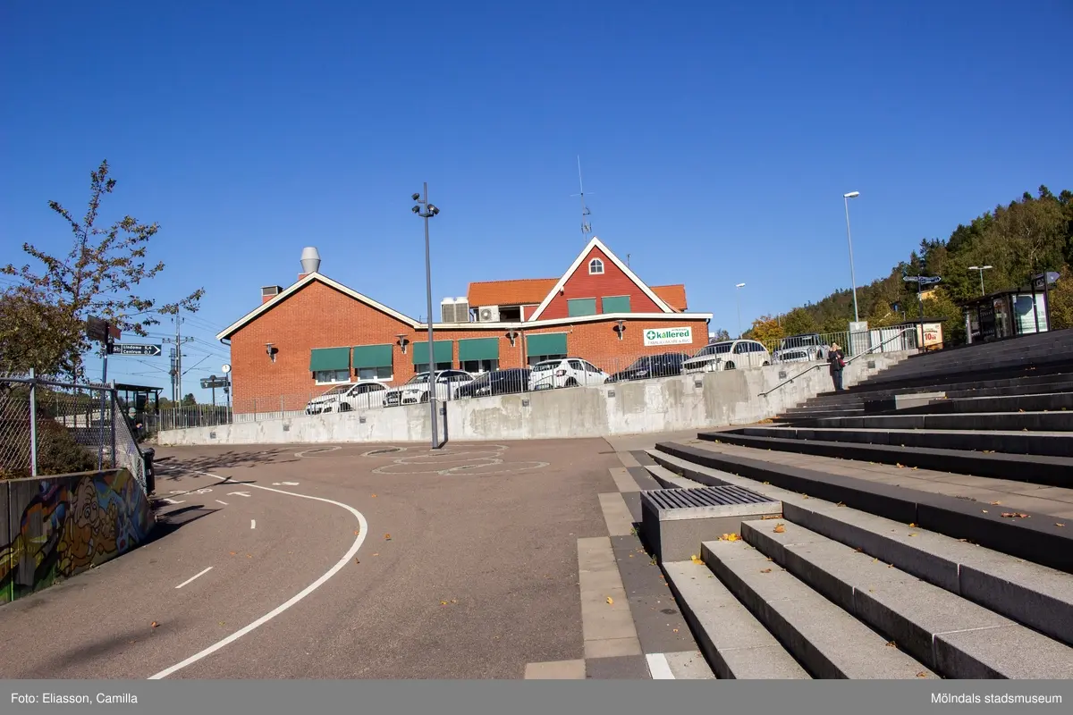 Trapporna från busstationen ner till Kållereds station. I bakgrunden ses gaveln till huset Gamla Riksvägen 44 som inrymmer vårdcentralen Nötkärnan Kållered. Vy mot norr. Kållereds centrum den 6 oktober 2016.