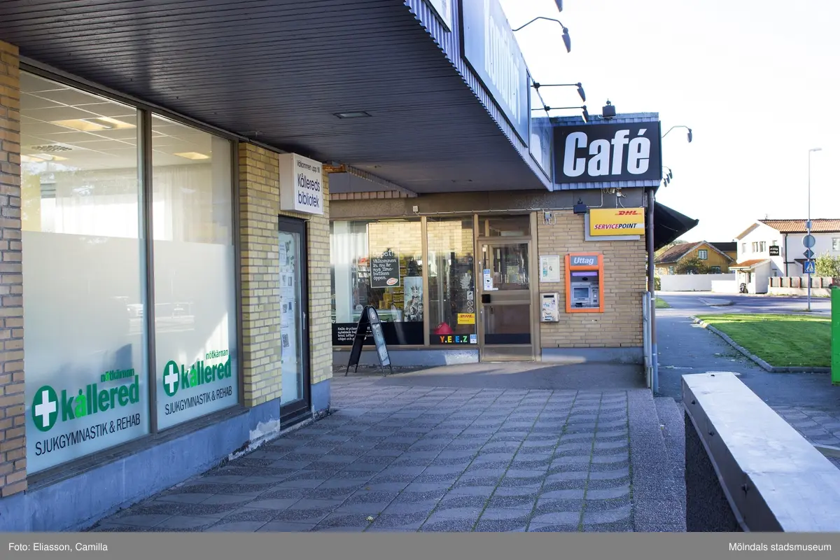 Affärsbyggnader vid torget i Kållereds centrum den 6 oktober 2016. Till vänster ses sjukgymnastik- och rehab-lokal tillhörande Nötkärnan Kållered i byggnaden Gamla Riksvägen 67 och rakt fram en Time-butik på Hagabäcksleden 1.