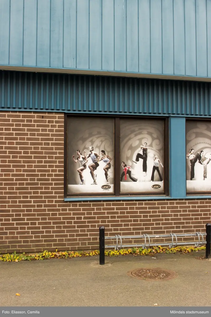 Del av fasaden, med ett par fönster, till Åbybadet/Åby simhall med adress Idrottsvägen 9 i Åby, Mölndal, den 11 oktober 2016.
