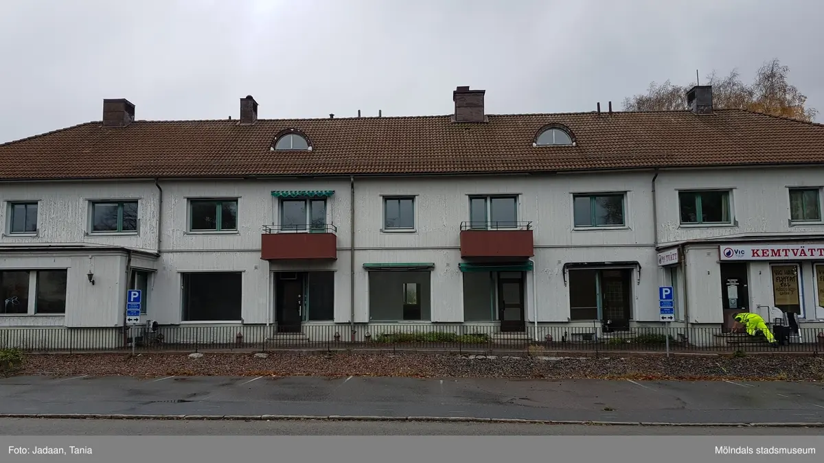Fastigheterna Mörten 2, Åbybergsgatan 30, till vänster, och Mörten 1, Åbybergsgatan 28, i Broslätt i Mölndal. Fasad mot söder. I mörten 2 låg tidigare Dagas Restaurang och Café. Affärsskylt till Vic Kemtvätt sitter på fasaden till Mörten 1. Fotografi taget den 2 november 2018. Byggnadsdokumentation inför rivning.
