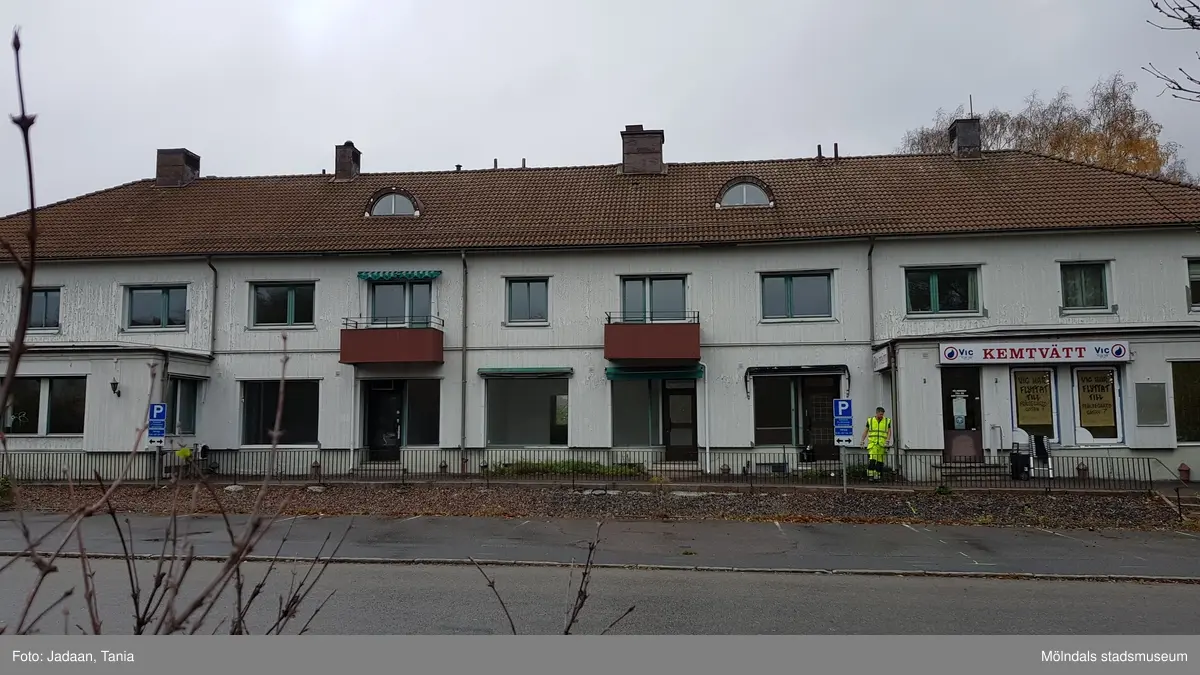 Fastigheterna Mörten 2, Åbybergsgatan 30, till vänster, och Mörten 1, Åbybergsgatan 28, i Broslätt i Mölndal. Fasad mot söder. I mörten 2 låg tidigare Dagas Restaurang och Café. Affärsskylt till Vic Kemtvätt sitter på fasaden till Mörten 1. Fotografi taget den 2 november 2018. Byggnadsdokumentation inför rivning.