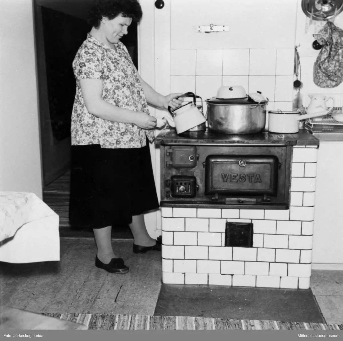 Lisa Honkavaara kokar kaffe vid "Libergs", intill spinneriet, vintern 1957.