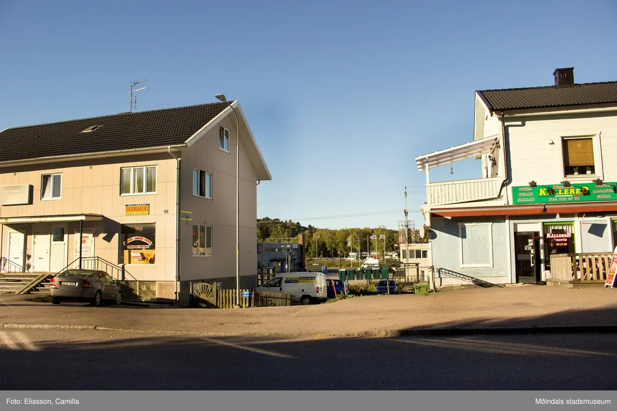 Till vänster ses huset Gamla Riksvägen 40 och till höger Gamla Riksvägen 38 i Kållereds centrum den 6 oktober 2016. I gatuplanet till nr 40 ses Kållereds Skomakeri och i nr 38 Kållered Pizzeria.