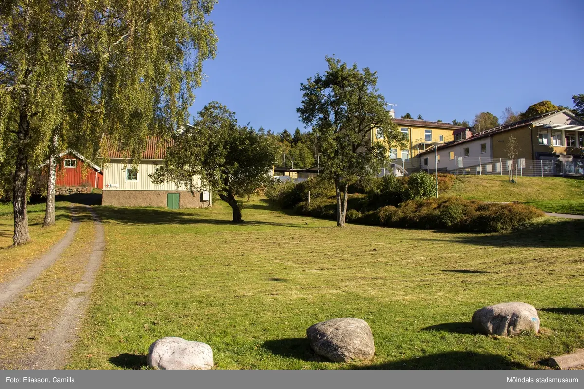 Våmmedal i Kållered den 6 oktober 2016. Till vänster ses ladugård och bostadshus med adress Streteredsvägen 7. Till höger del av Brattåsskolan, Streteredsvägen 9. Vy i riktning mot norr.