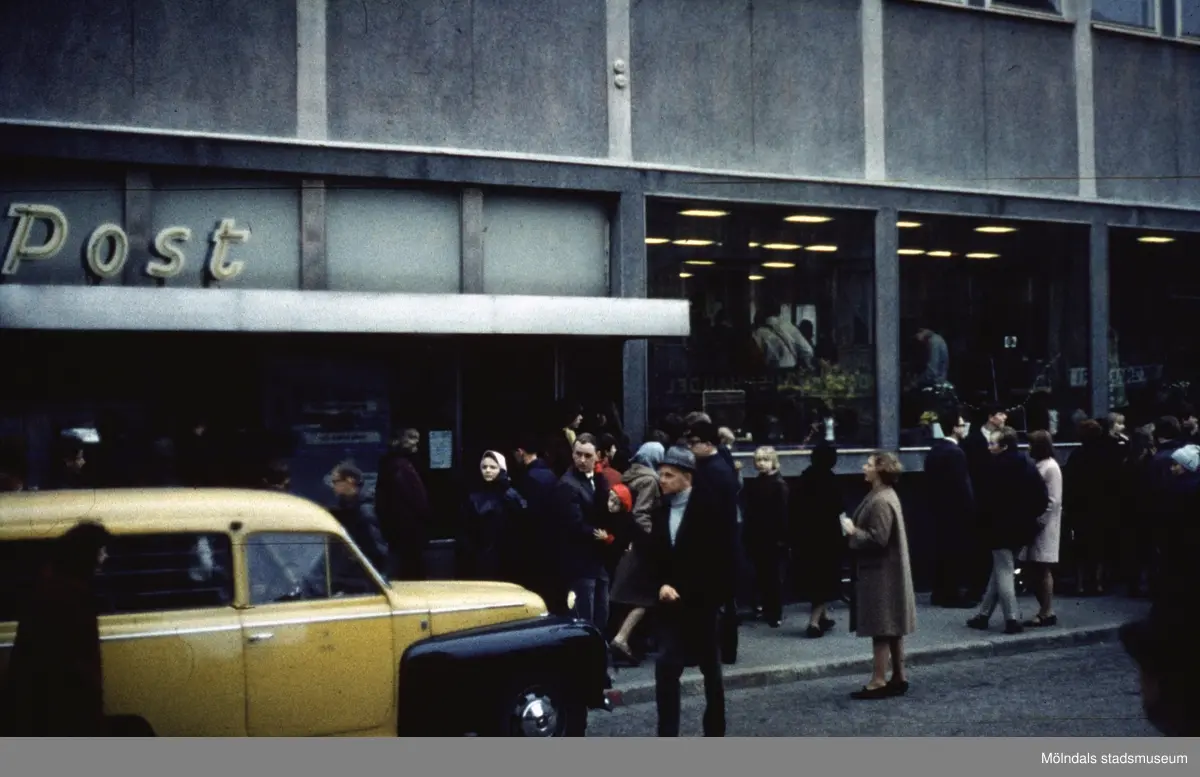 Folksamling utanför postkontoret på Frölundagatan (idag: Brogatan) i Mölndal, 1970-tal.