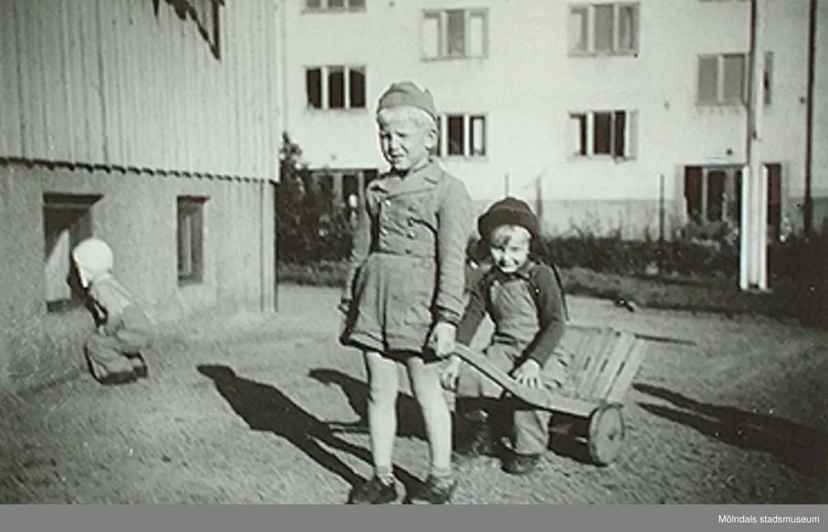 Sven Åke 5 år och Lennart 4 år. "Bråkiga och dumma kan dessa pojkar va´ men med tiden blir de´ säkert bra." Fotot sitter i albumet (invnr: 03395) "Krokslätts daghem, Dalhemsgatan 7, Mölndal. 2 juni 1948 - 30 sept 1951" illustrerat av Ruth Karlsson.