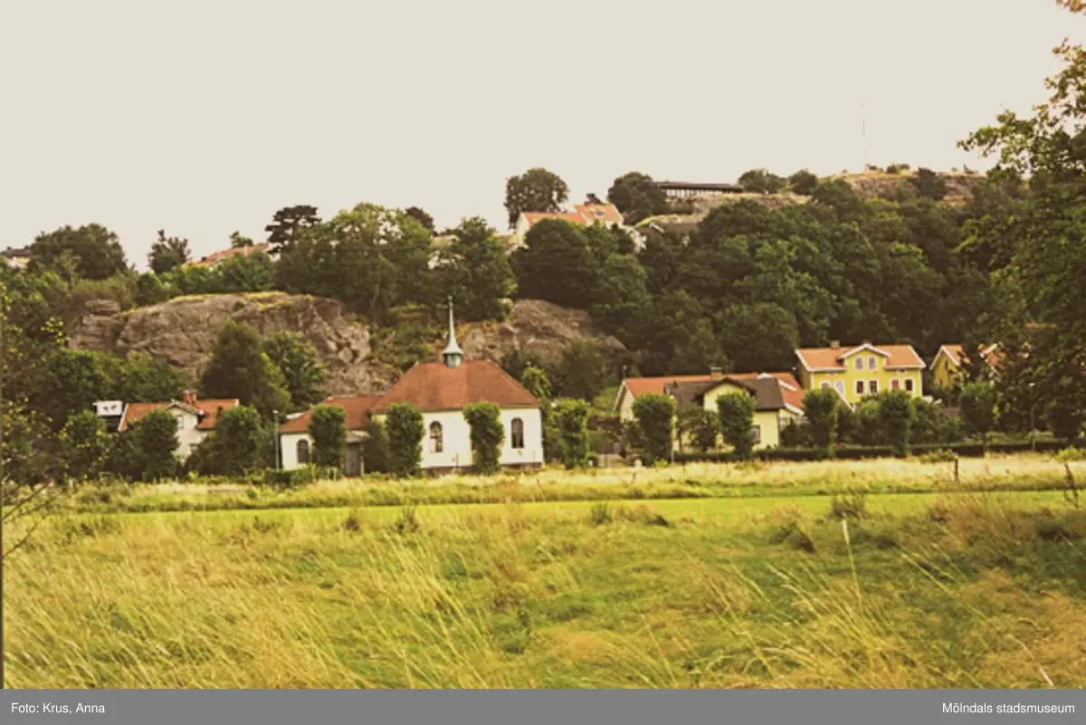 Mölndals Metodistkyrka med bostäder och ängar i förgrunden år 1999. Översikt över stadsdelen Forsåker.