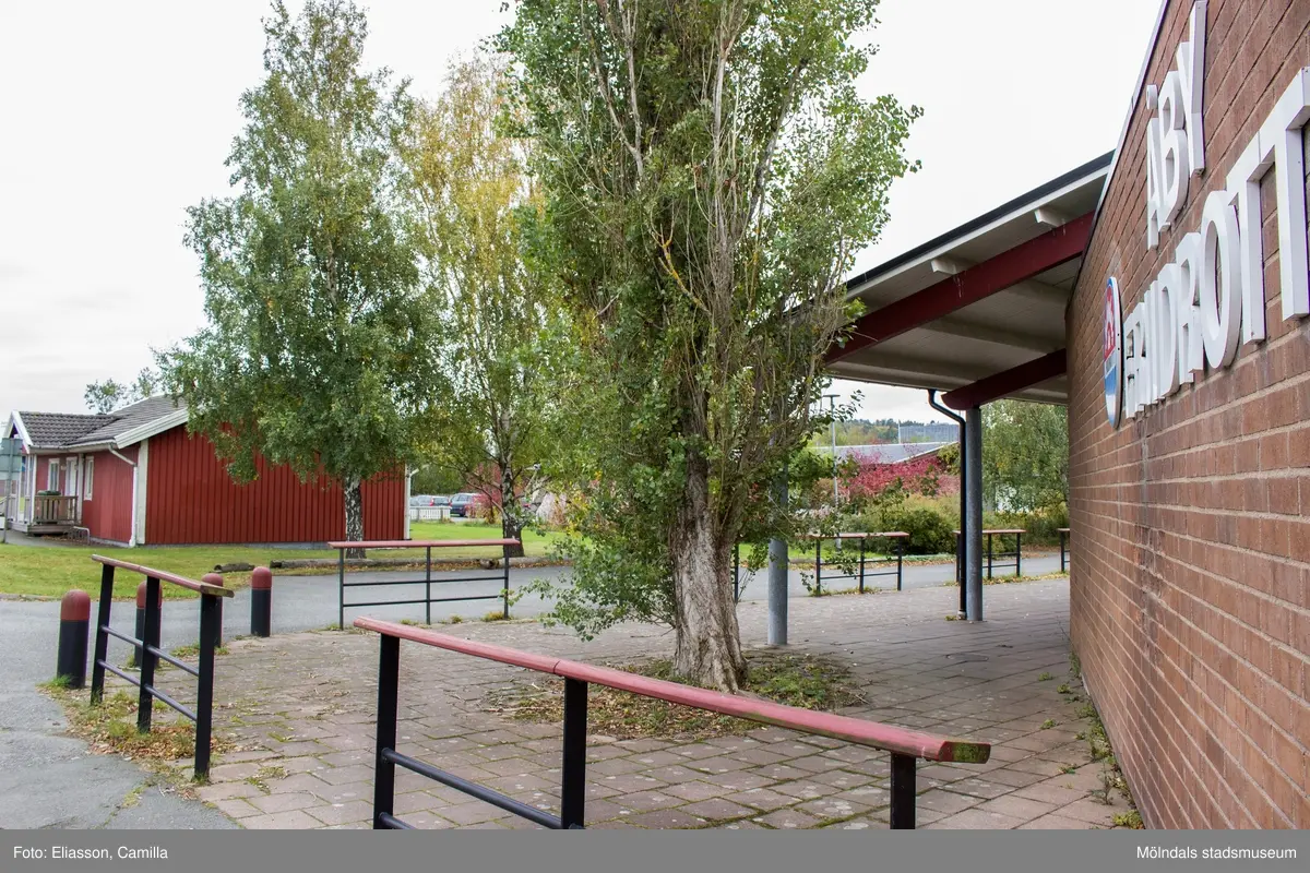 Entrén till friidrottsarenan Åby Friidrott med adress Idrottsvägen 23 i Åby, Mölndal, den 11 oktober 2016. Till vänster ses även Mölndals Allmänna Smisällskaps (MASS) klubbhus med adress Idrottsvägen 15. Vy mot sydost.