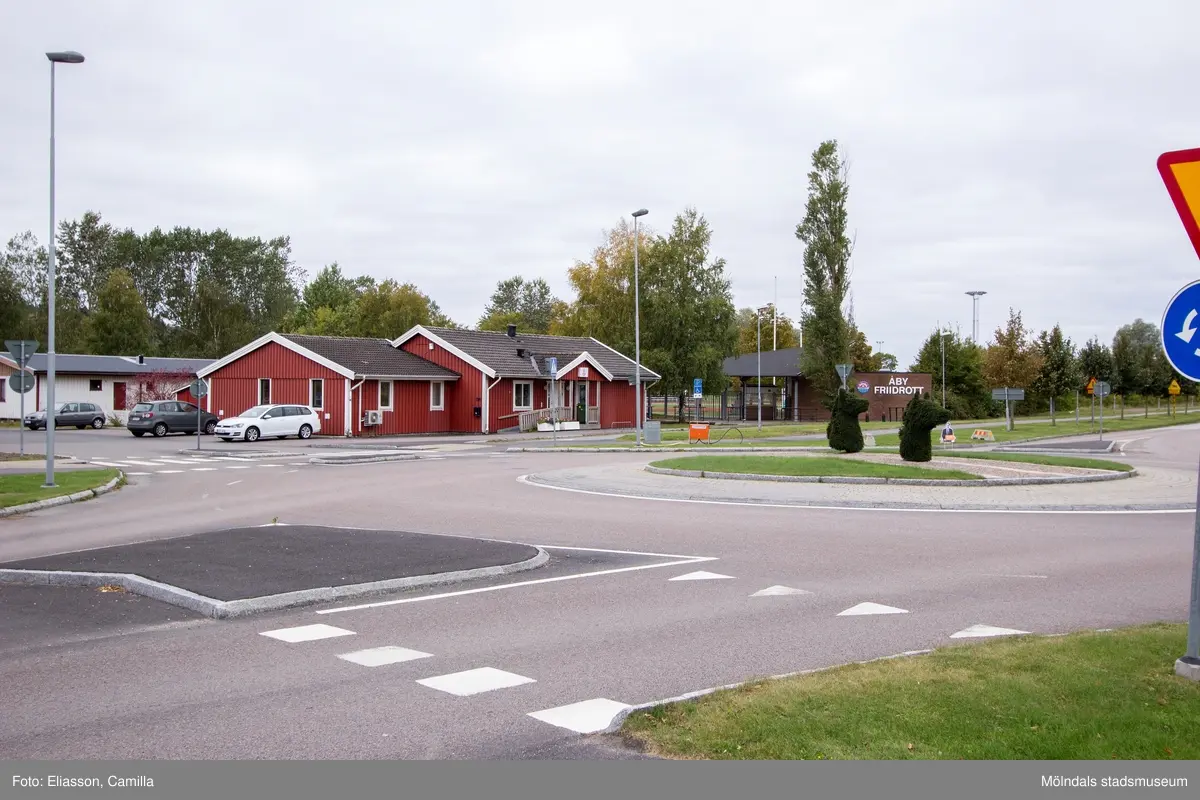 Cirkulationsplats var Idrottsvägen möter Ragnar Thorngrens gata i Åby, Mölndal, den 11 oktober 2016. På andra sidan cirkulationsplatsen ses Mölndals Allmänna Simsällskaps (MASS) klubbhus med adress Idrottsvägen 15 samt idrottsarenan Åby Friidrotts entré med adress Idrottsvägen 13. Vy mot sydväst.