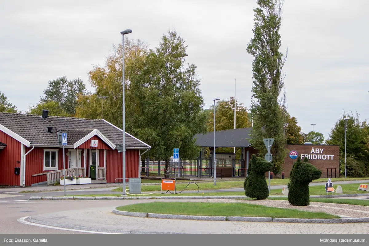 Cirkulationsplats var Idrottsvägen möter Ragnar Thorngrens gata i Åby, Mölndal, den 11 oktober 2016. På andra sidan cirkulationsplatsen ses Mölndals Allmänna Simsällskaps (MASS) klubbhus med adress Idrottsvägen 15 samt idrottsarenan Åby Friidrotts entré med adress Idrottsvägen 13. Vy mot sydväst.