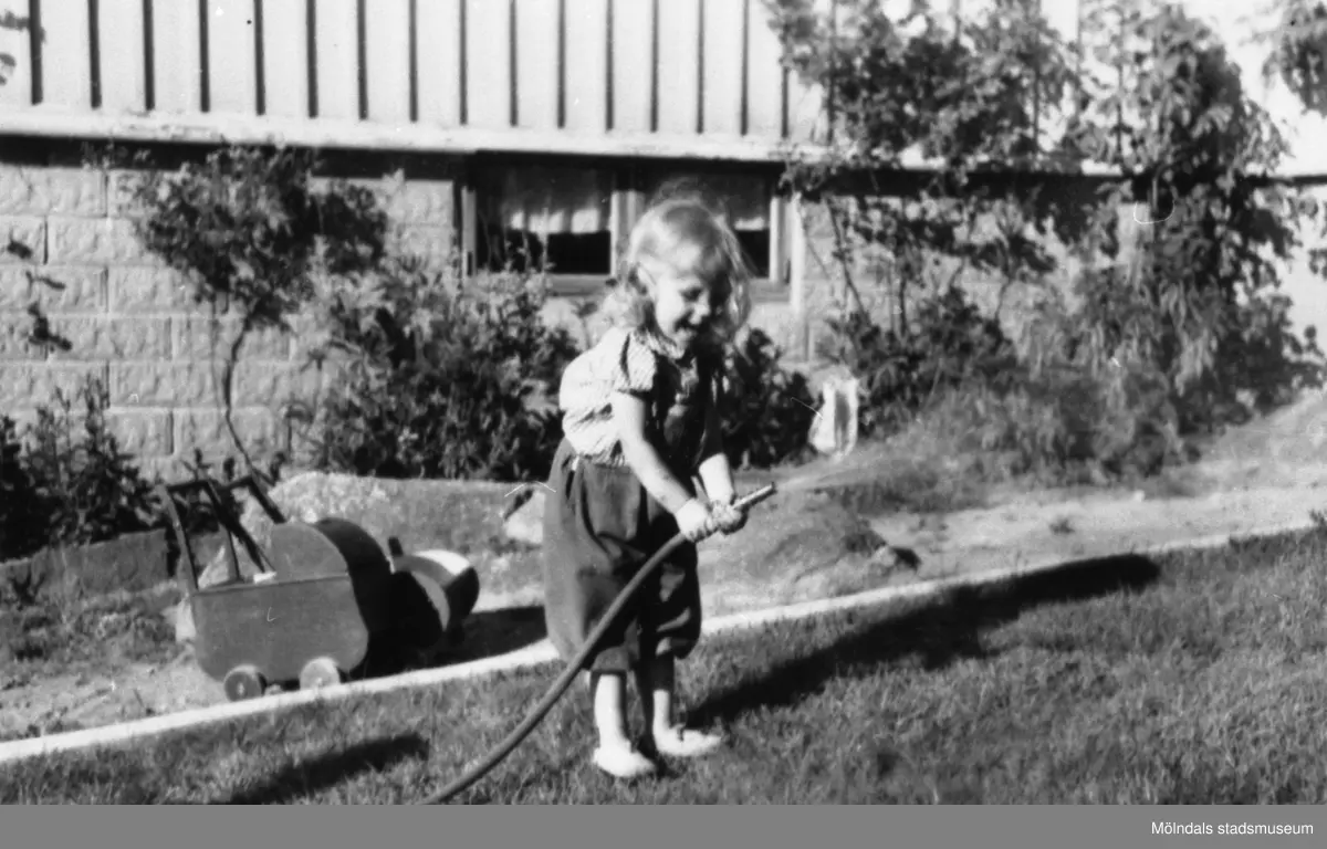 Karin Pettersson (gift: Hansson) sprutar vatten med en trädgårdsslang på Gamlehagsvägen i Torrekulla, ca 1950.