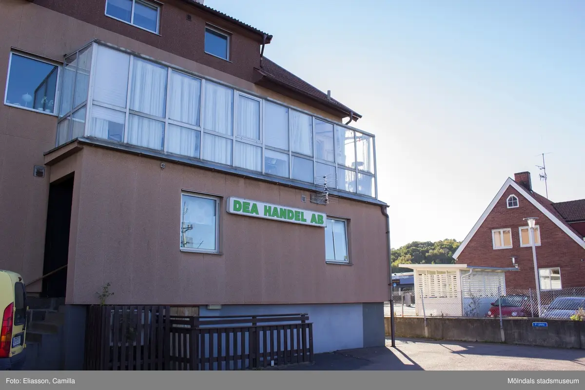 Byggnader vid Gamla Riksvägen i Kållereds centrum den 6 oktober 2016. Närmast ses västra fasaden (baksidan) av huset Gamla Riksvägen 42 som inrymmer butiken Kållereds Gammalt & Nytt i gatuplanet. På fasaden sitter en affärsskylt för DEA handel AB. Till höger ses gavel till byggnaden Gamla Riksvägen 44 som inrymmer vårdcentralen Nötkärnan Kållered.