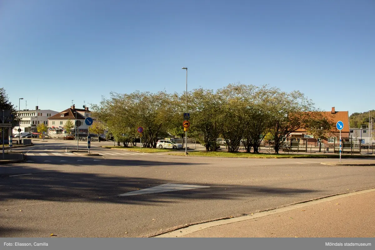 Kållereds centrum den 6 oktober 2016. Vy mot sydväst från Streteredsvägen. Busshållplatser i anslutning till Kållereds station. I bakgrunden till vänster ses servicebutiken i huset Gamla Riksvägen 48 A samt även huset 48 B. I bakgrunden till höger ses vårdcentralen med adress Gamla Riksvägen 44.