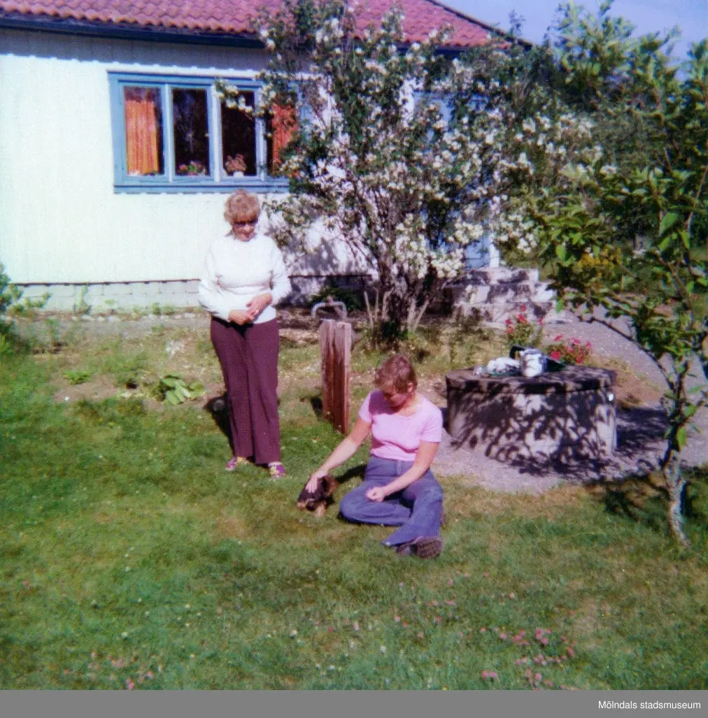 Sommarstuga med fastighetsbeteckning Gårda 2:45 och adress Varvsvägen 13 i Gårda, Lindome, i Mölndals kommun. Fotografiet är taget under slutet av 1960-talet. I trädgården ses Margit Johansson med svärdottern Monica.