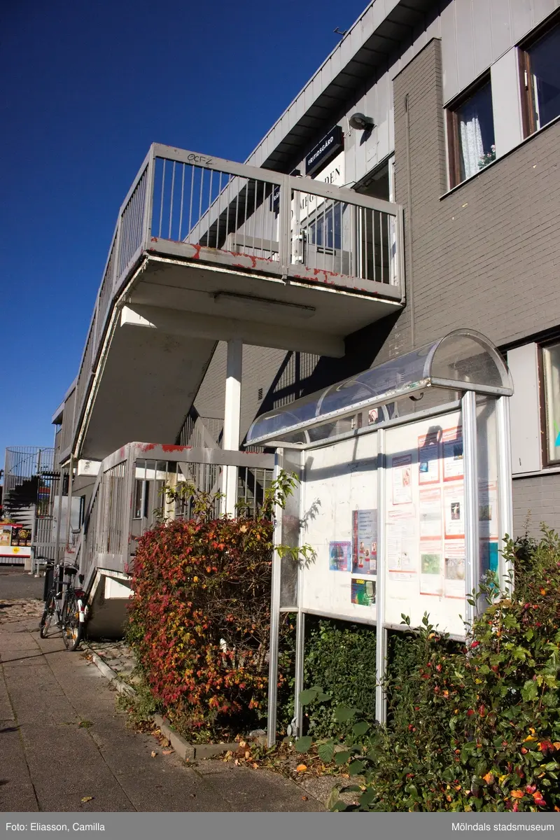 Huset Almåsgången 1 i Lindome centrum den 4 oktober 2016. Trappa och entré till Bio Etage och fritidsgården Lindomegården. Byggnadens fasad vetter mot söder. En anslagstavla är uppstalld på utsidanav byggnaden.