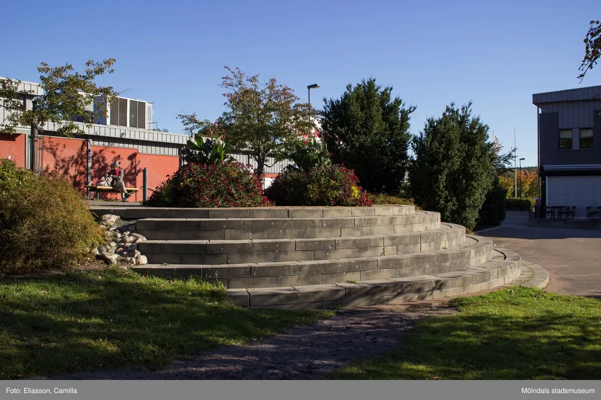 Liten park i Lindome centrum den 4 oktober 2016. I bakgrunden till vänster ses huset Almåsgången 2 som inrymmer bland annat ICA Supermarket, till höger del av huset Almåsgången 1 där bland annat Druvan Pizzeria huserar. Vy mot nordost.