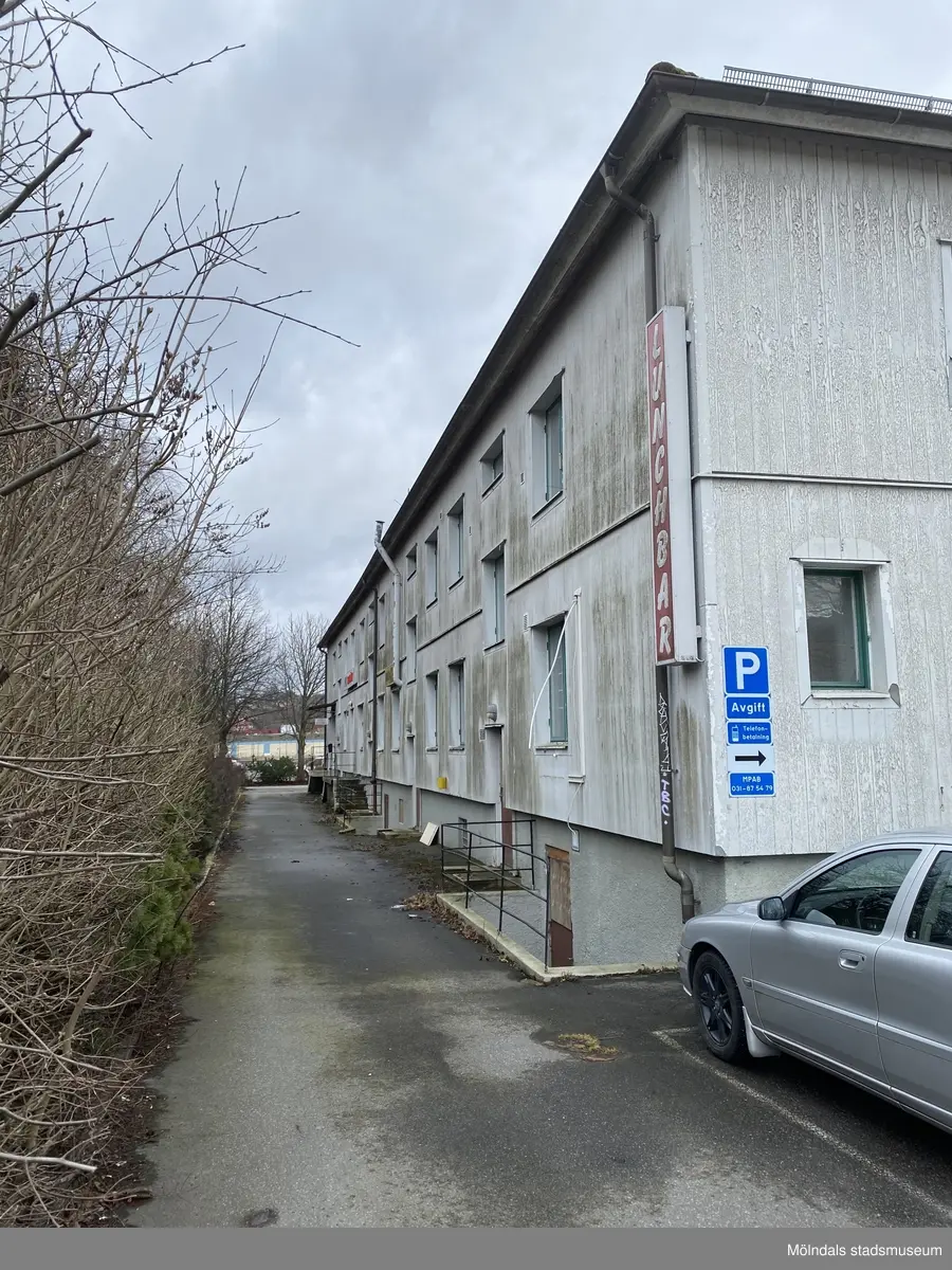 Fotografi som visar exteriören av fastigheterna Mörten 2 och 1 (nuvarande Mörten 6), Åbybergsgatan 30 och 28 i Broslätt i Mölndal. Fasad mot norr, gavel mot väster. Förutom lägenheter fanns det i huset en resturanglokal som tidigare inrymt Dagas Restaurang och Café. Restaurangen låg i närmsta delen av huset, i Mörten 2. Vic Kemtvätt låg i andra änden av huset, i Mörten 1. Okänt datum för fotografering. Byggnadsdokumentation inför rivning.
