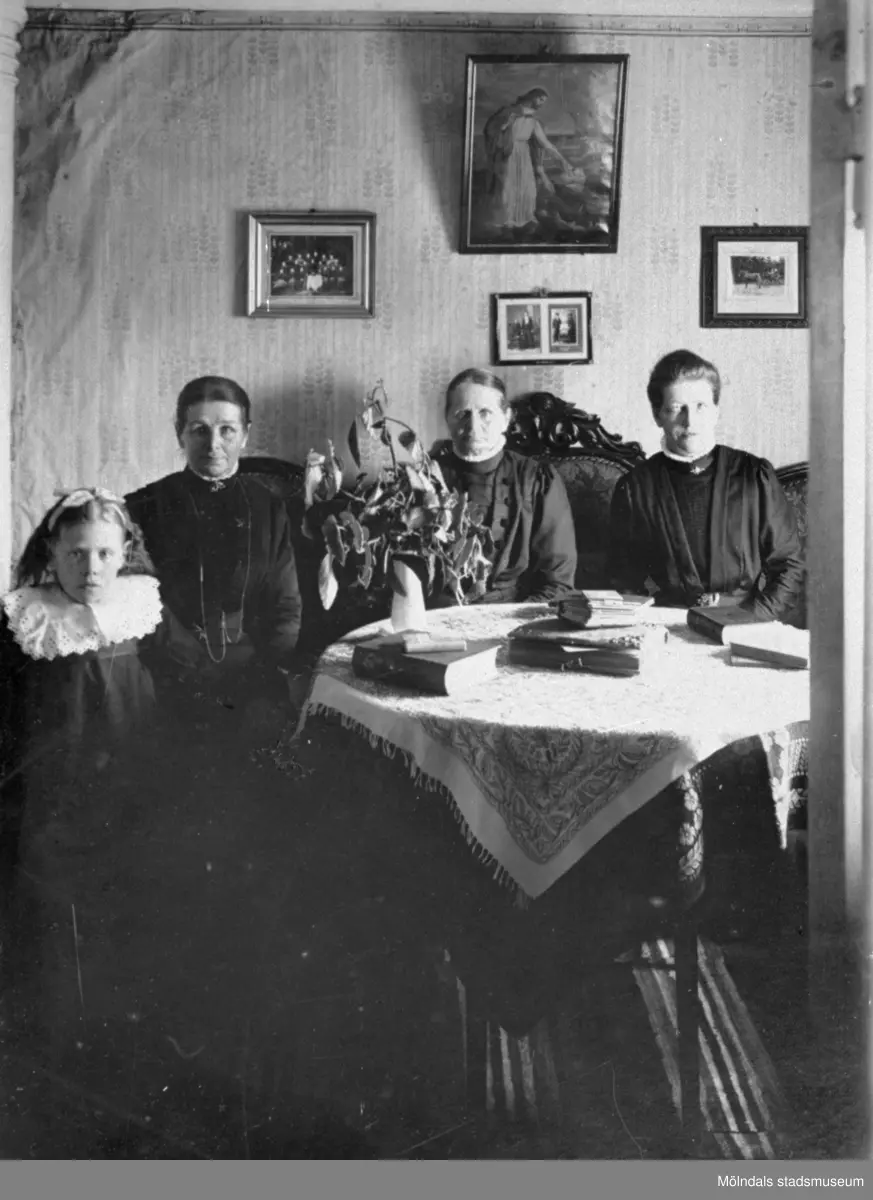Från vänster ses fosterbarnet Märta Persson, systrarna Josefina och Maria Eriksson samt deras piga Anna Carlsson i Olas stuga 1900-tal.