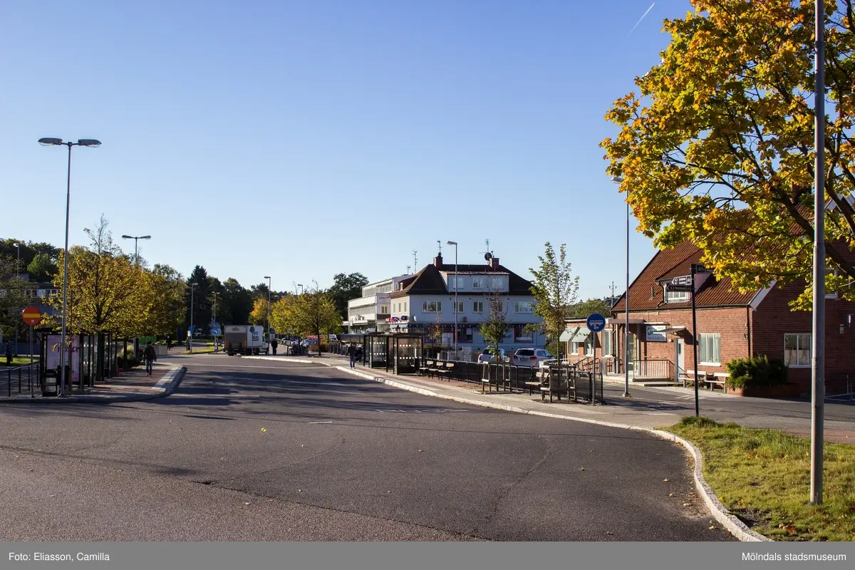 Kållereds centrum den 6 oktober 2016. Gamla Riksvägen i rktning söderut. Busshållplatser i anslutning till Kållereds station. Till höger ses närmast vårdcentralen med adress Gamla Riksvägen 44. Bortanför vårdcentralen ses servicebutiken i huset Gamla Riksvägen 48 A samt även huset 48 B.