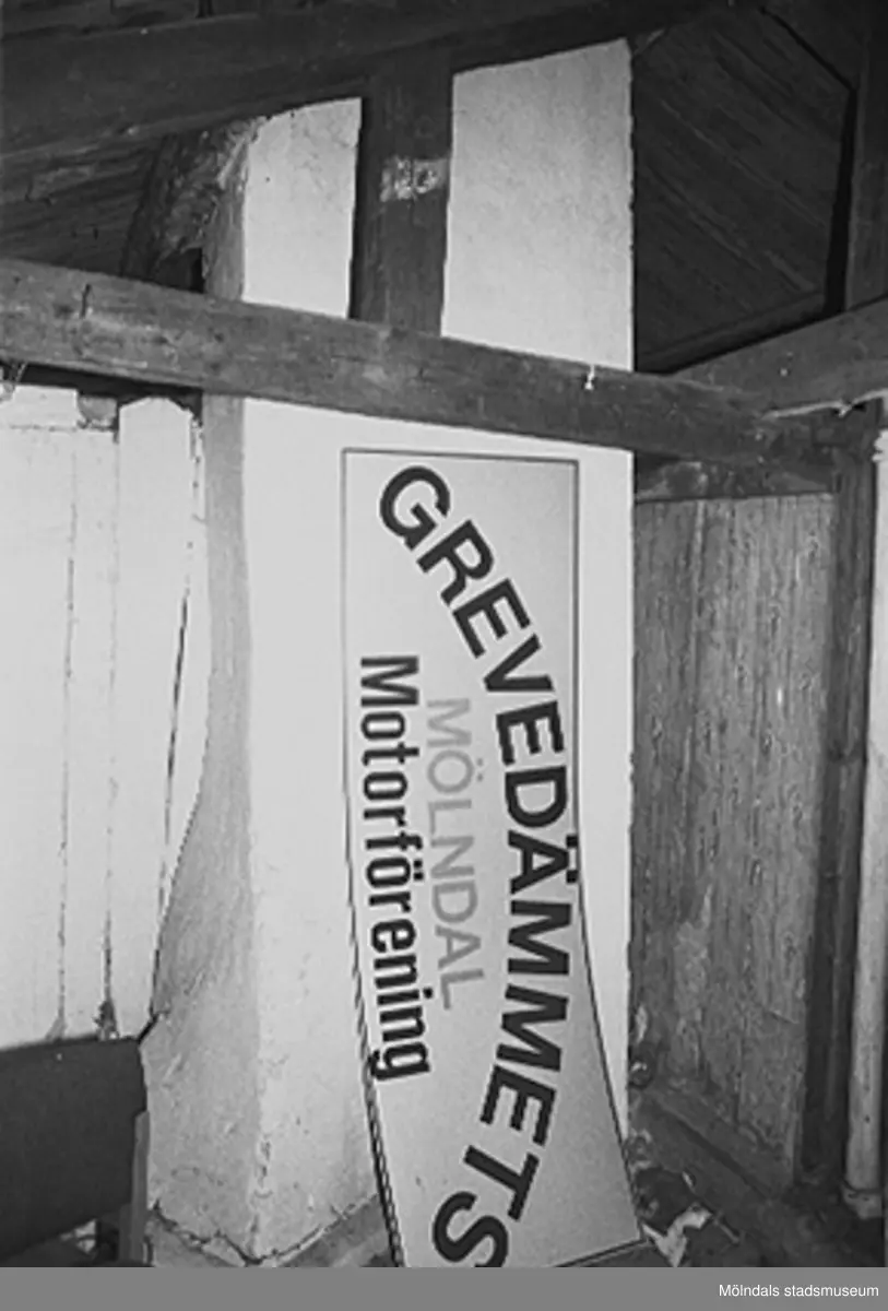 Kvarnfallet 31 i Grevedämmet, hösten 1994. Skylt lutad mot en pelare: "GREVEDÄMMETS MÖLNDAL Motorförening" i Röda huset, G-3. Interiör av vinden. Den murstock som i mitten av huset går genom de tre våningarna. Mycket gamla tapeter syns på väggen till höger om murstocken. Tapetprover lämnades till Mölndals museum 1995, för analys.