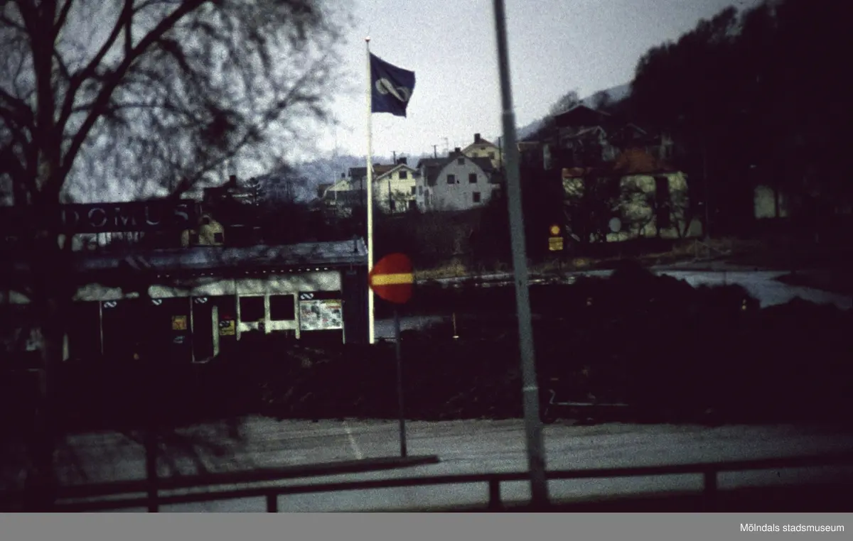 Vy norrut på huvudentrén till Domus barack vid Nya Torget i Mölndal, 1970-tal. I fonden till höger ses närmast (bakom dungen) Missionskyrkan samt villor i området Trädgården.