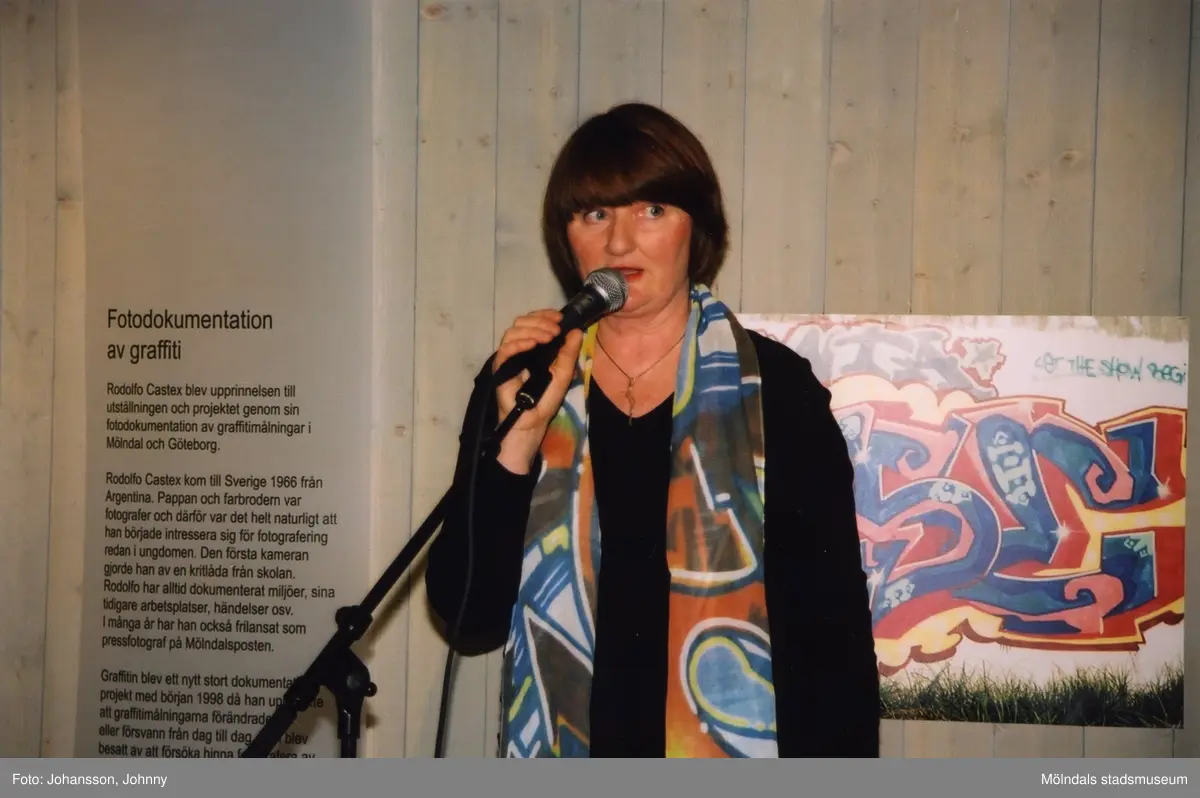 Museichef Mari-Louise Olsson talar vid invigningen av utställningen "Alltså finns jag" på Mölndals museum, år 2003.