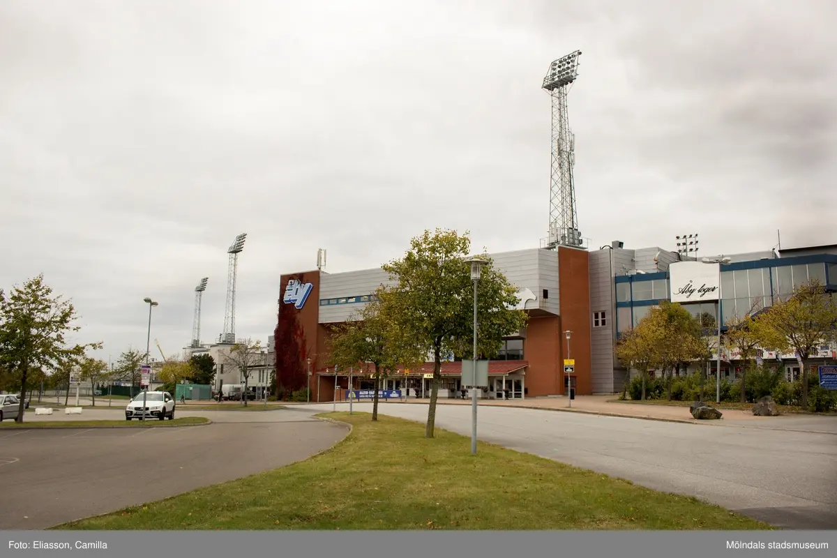 Byggnad tillhörande Åbytravet i Åby, Mölndal, den 11 oktober 2016. Fasaden vetter mot sydost.
