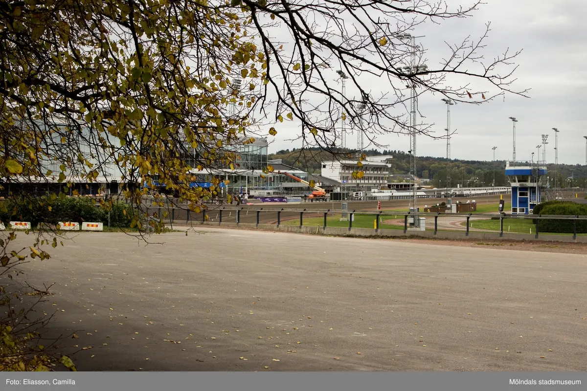 Byggnader och travbana tillhörande Åbytravet i Åby, Mölndal, den 11 oktober 2016. Vy mot sydväst.