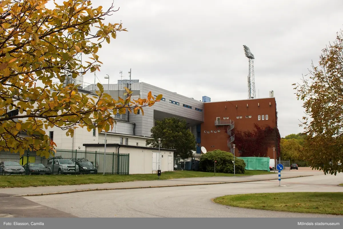 Byggnader tillhörande Åbytravet i Åby, Mölndal, den 11 oktober 2016. Vy mot nordost.