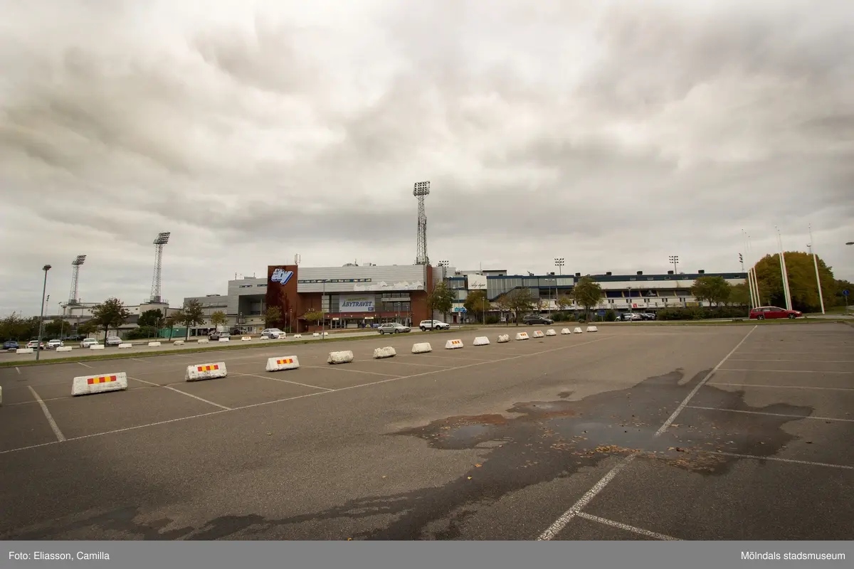 Byggnader tillhörande Åbytravet i Åby, Mölndal, den 11 oktober 2016. Fasaderna vetter mot sydost. Vy från parkeringsplatsen på utsidan.