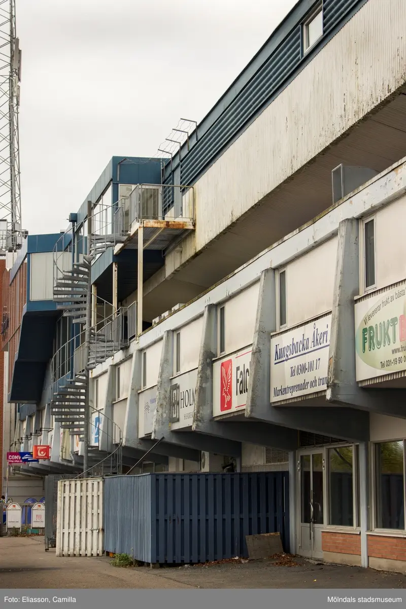 Detalj av fasaden till byggnad tillhörande Åbytravet i Åby, Mölndal, den 11 oktober 2016. Fasaden vetter mot sydost.