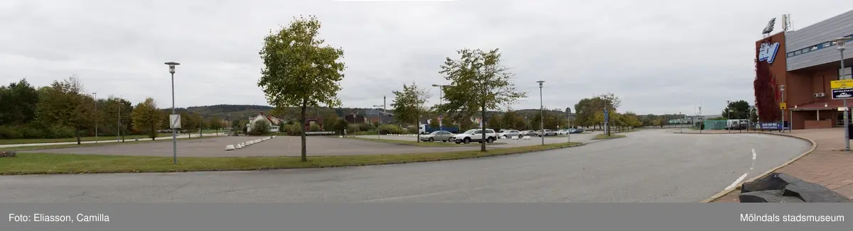Panorama mot parkeringsplats tillhörande Åbytravet i Åby, Mölndal, den 11 oktober 2016. Vy mot sydväst. Till vänster ses Åbyvägen.