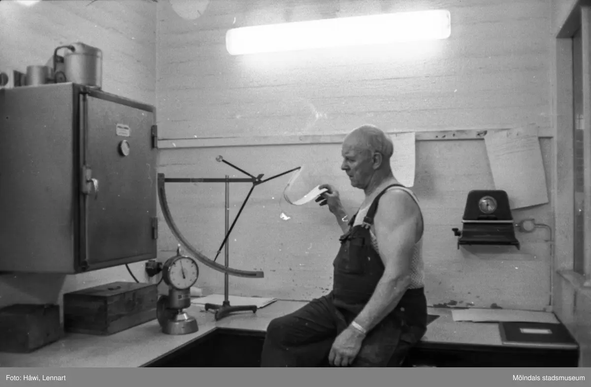 Man i arbete vid mätinstrument på pappersbruket Papyrus i Mölndal, hösten 1970.