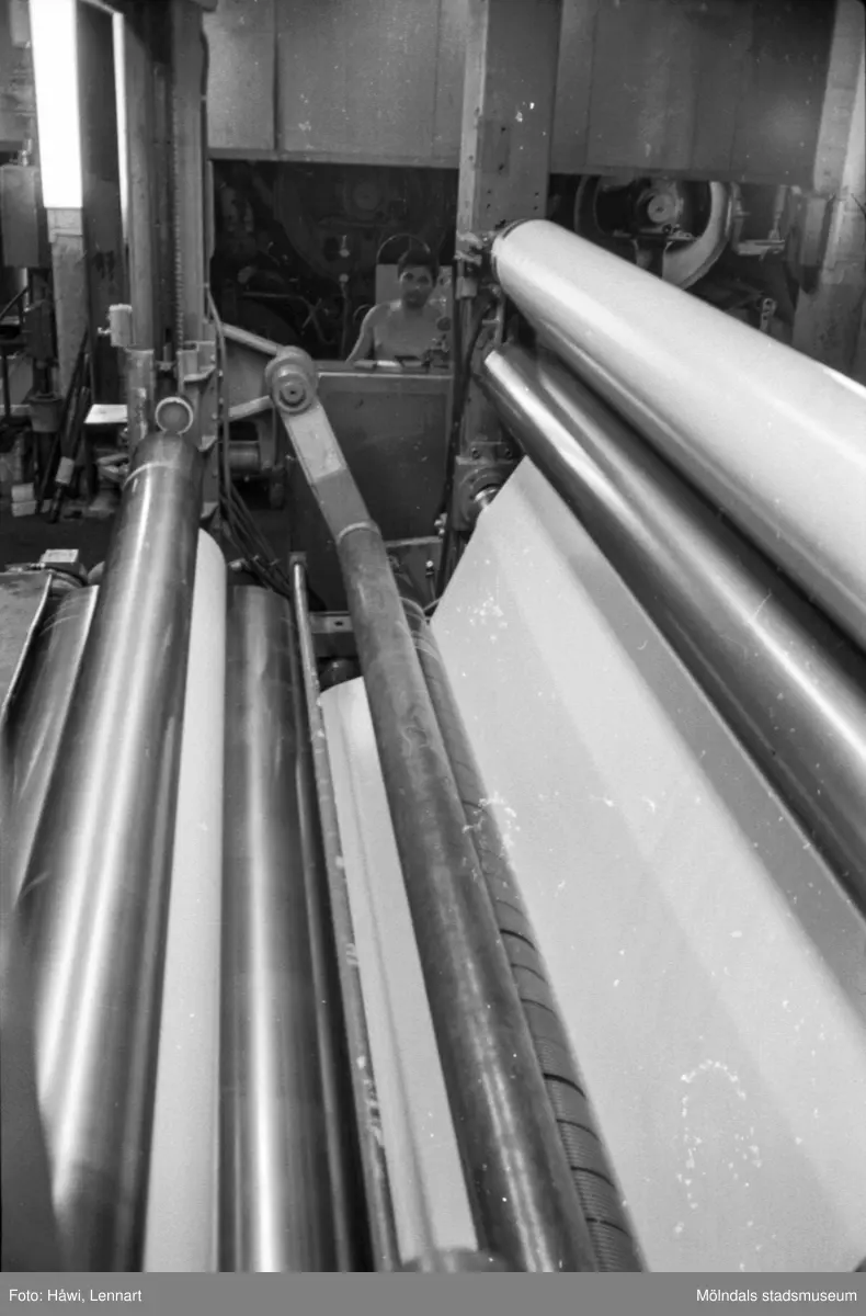 Man i arbete vid maskin, RM 5. I bakgrunden syns PM 12, senare omdöpt till PM 7. Pappersbruket Papyrus i Mölndal, hösten 1970.