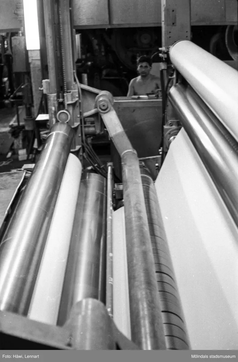 Titel: Man i arbete vid maskin på pappersbruket Papyrus i Mölndal, hösten 1970.