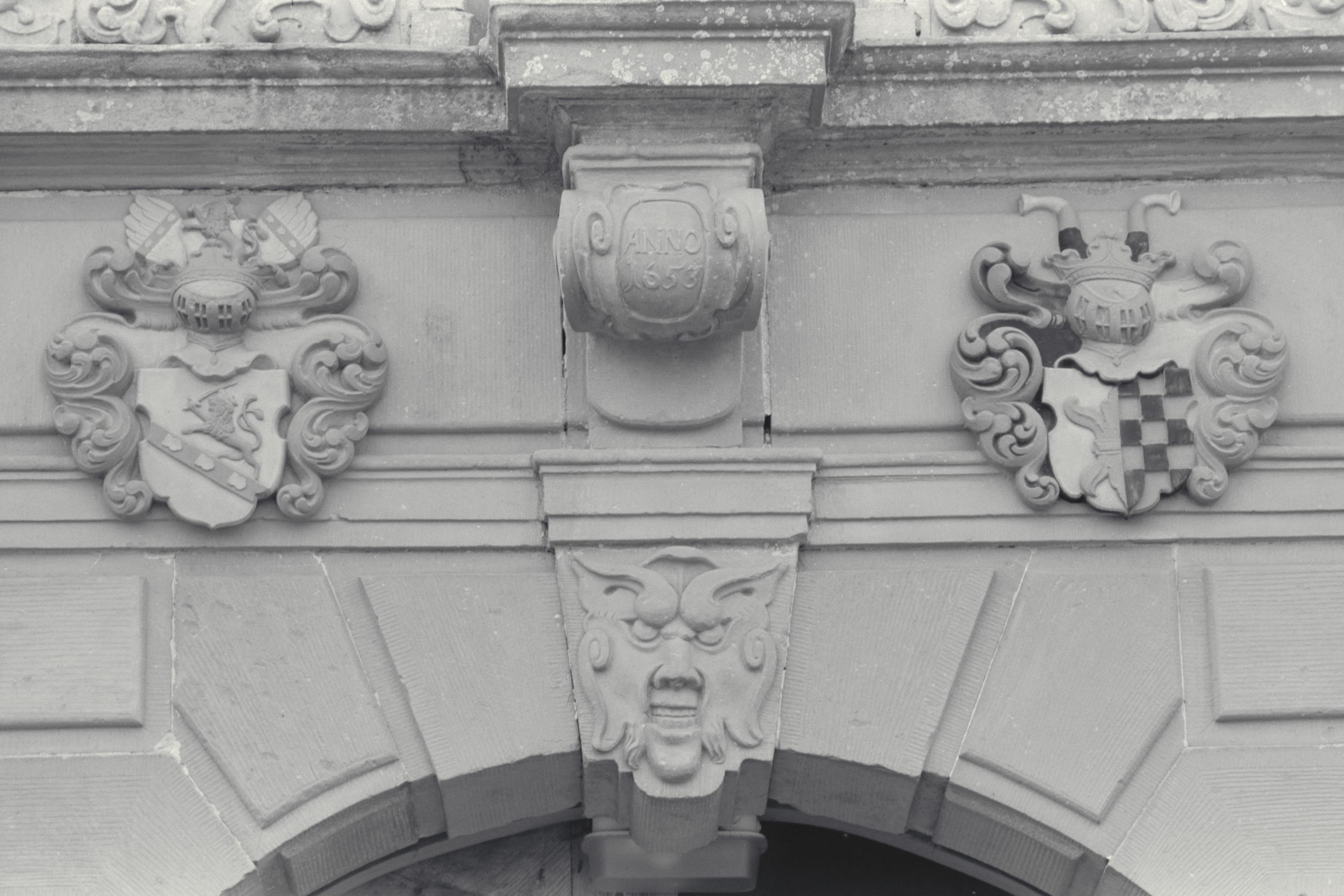 Huvudbyggnadens portal. Slutsten och fris med vapentavlor