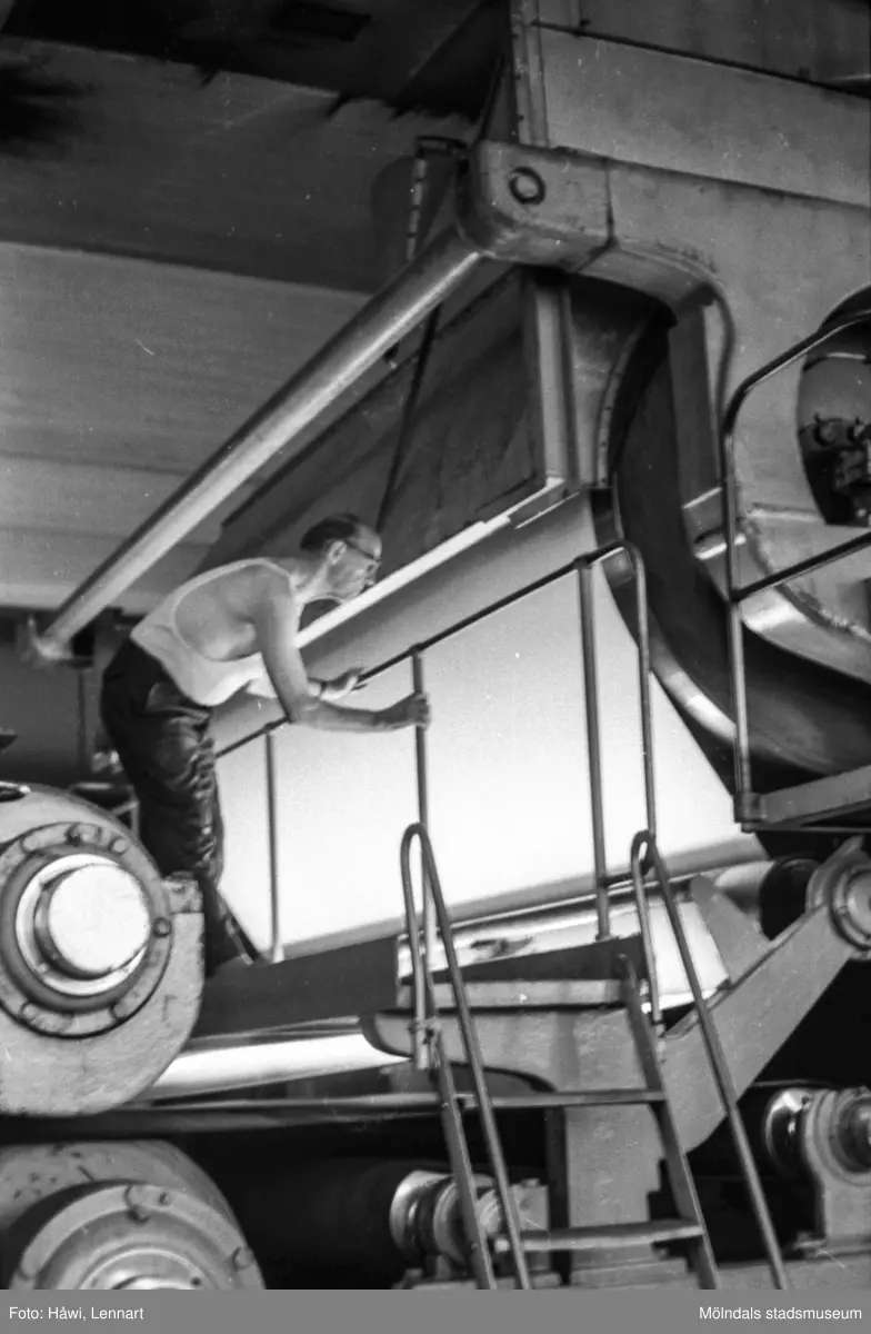 Titel: Man i arbete vid maskin på pappersbruket Papyrus i Mölndal, hösten 1970.