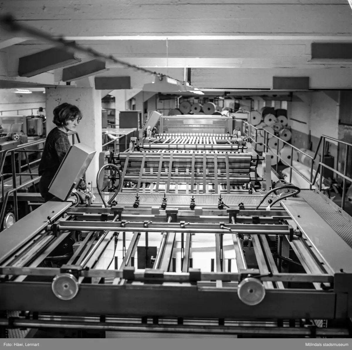 Kvinna i arbete vid maskin på pappersbruket Papyrus i Mölndal 1/10 1969.
