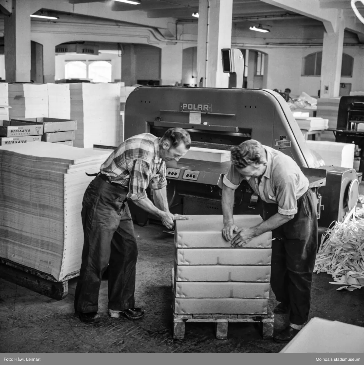 Män i arbete vid maskin på pappersbruket Papyrus i Mölndal, 15/11 1958.