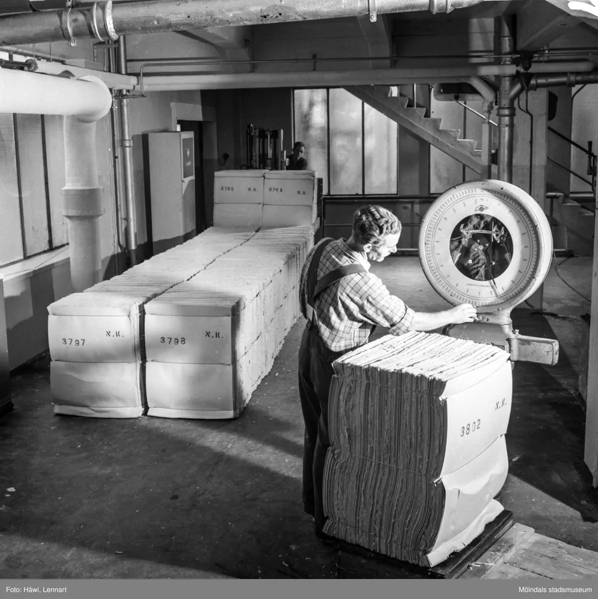 Man i arbete vid våg på pappersbruket Papyrus i Mölndal, 15/11 1958.