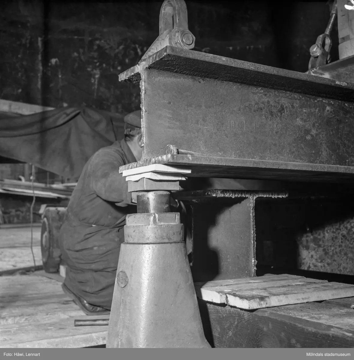Transport av PM2 yankeecylinder på pappersbruket Papyrus i Mölndal, 12/4 1957. Detalj av domkraft och stålbalkar.