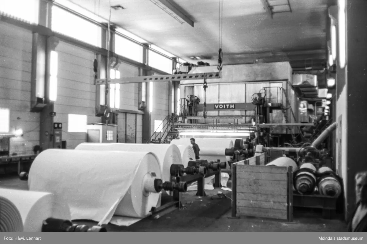 Man i arbete vid maskin, PM 5. Maskinen kördes igång hösten 1965. Pappersbruket Papyrus i Mölndal, hösten 1970.