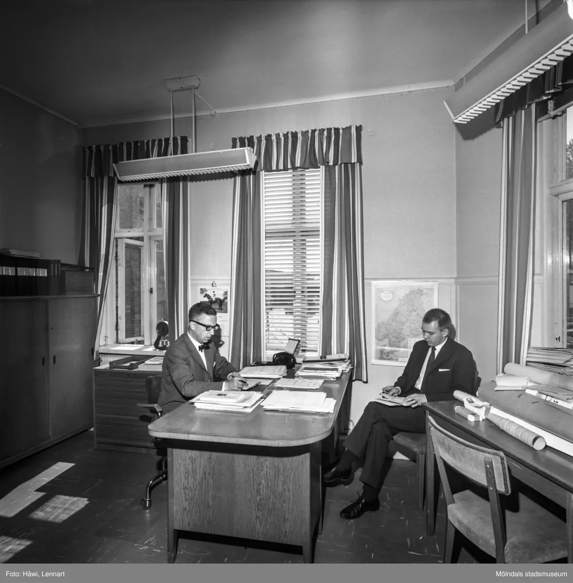 Interiörbild från pappersbruket Papyrus i Mölndal 25/5 1964. Två män i ett kontor.