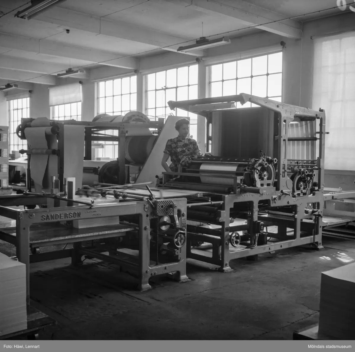 Kvinna i arbete vid linjeringsmaskin på pappersbruket Papyrus i Mölndal, 6/5 1955.