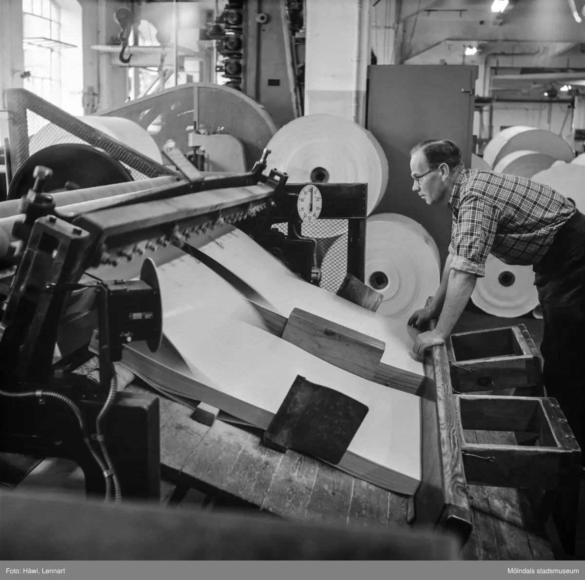 Man i arbete vid klipp nr 13 på pappersbruket Papyrus i Mölndal, 6/5 1955.