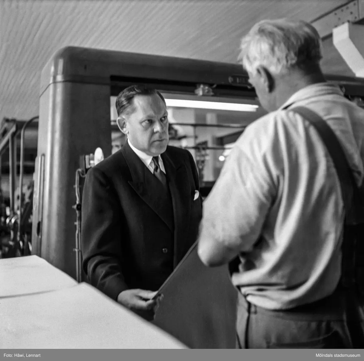 Disponent Hans Hulthén i samtal med en arbetare på pappersbruket Papyrus i Mölndal, 15/5 1955.