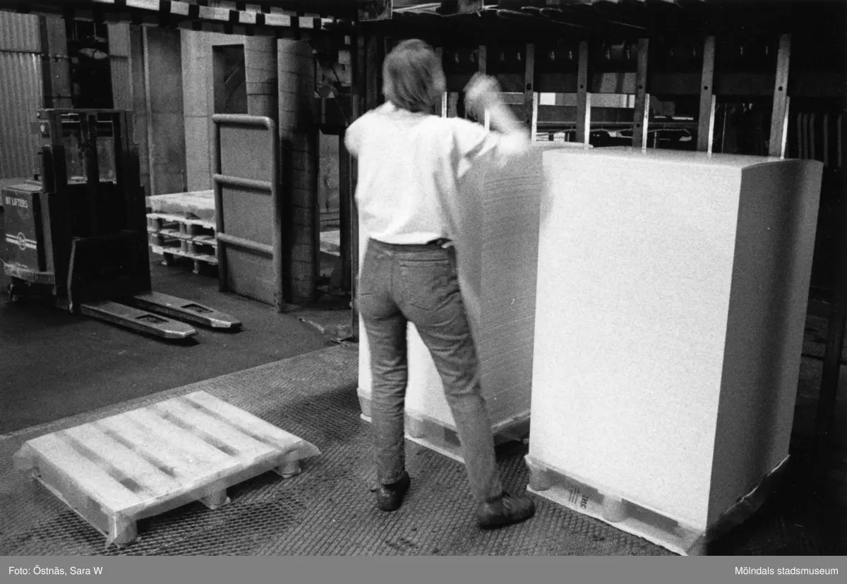 Kvinna i arbete med kartongpall på pappersbruket Papyrus i Mölndal, år 1990.