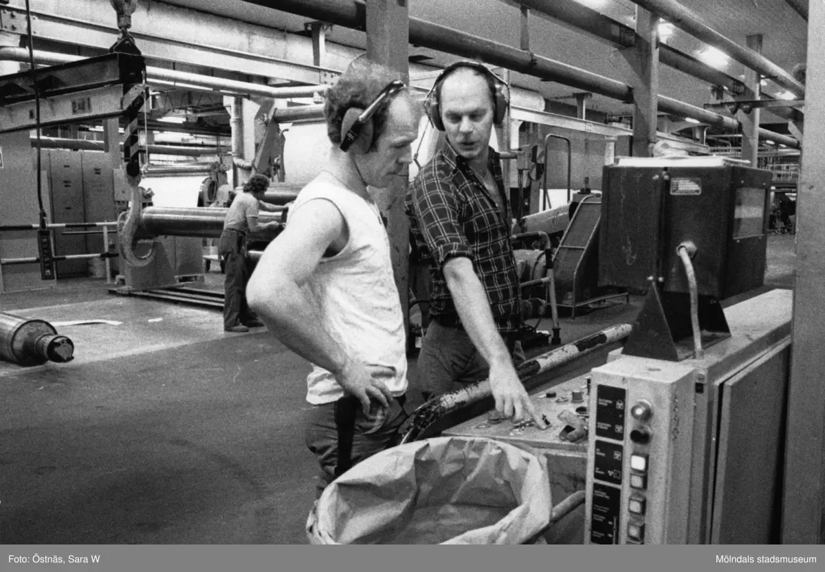 Jan Callesen och Denny Andersson i arbete vid maskin på pappersbruket Papyrus i Mölndal, år 1990.